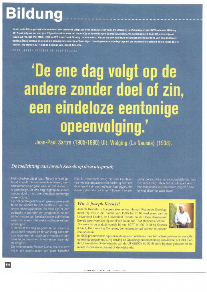 Maandag 16 januari was de blauwe maandag van het jaar 2017. Voor de Bildungscheurkalender koos Joseph Kessels een citaat van Jean-Paul Sartre uit Walging (La Nausée). Het tijdschrift VanTwaalftotAchttien nodigde hem uit om hier een toelichting op te geven en een favoriete tekst uit diezelfde maand te kiezen. De keuze viel op de bijdrage van Hans Verspikken (Bildung 2017 op 25 januari), die een uitspraak van Brené Brown presenteerde.