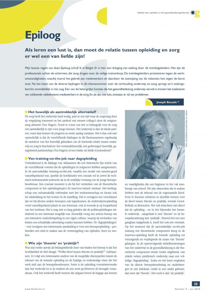 Kessels, J.W.M. (2010). Als leren een lust is, dan moet de relatie tussen opleiding en zorg er wel een van liefde zijn! Onderwijs en Gezondheidszorg. (4) 35 – 36. (ISSN 0920-8100)