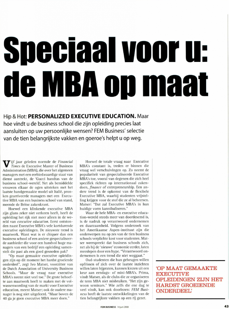 Kroon, J. en Groothengel, P. (2008). Speciaal voor u: de MBA op maat, FEM Business (24), 43-56