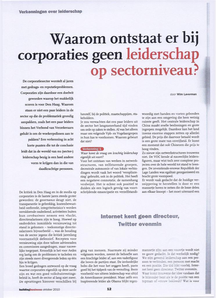 Laverman, W. (2010). Waarom ontstaat er bij corporaties geen leiderschap op sectorniveau? Building Buisiness, 12(8), 12,13,15.