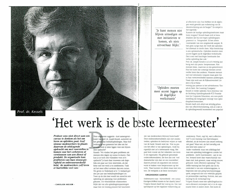 Gemeenten besteden naar schatting twee procent van hun loonsom aan opleiding en training. Dat is twintig miljoen gulden per jaar. Prangende vraag: spekken deze opleidingsmiljoenen vooral de zakken van de opleidingsinstituten of 'leveren ze ook een bijdrage aan het beter functioneren van (de overheid? Lang niet altijd, vindt professor Joseph Kessels, de eerste en enige hoogleraar in Nederland op het terrein van bedrijfsopleiding. Opleiding en training moeten niet van het dagelijkse werk worden geïsoleerd, maar daaraan direct worden gekoppeld, betoogt Kessels.