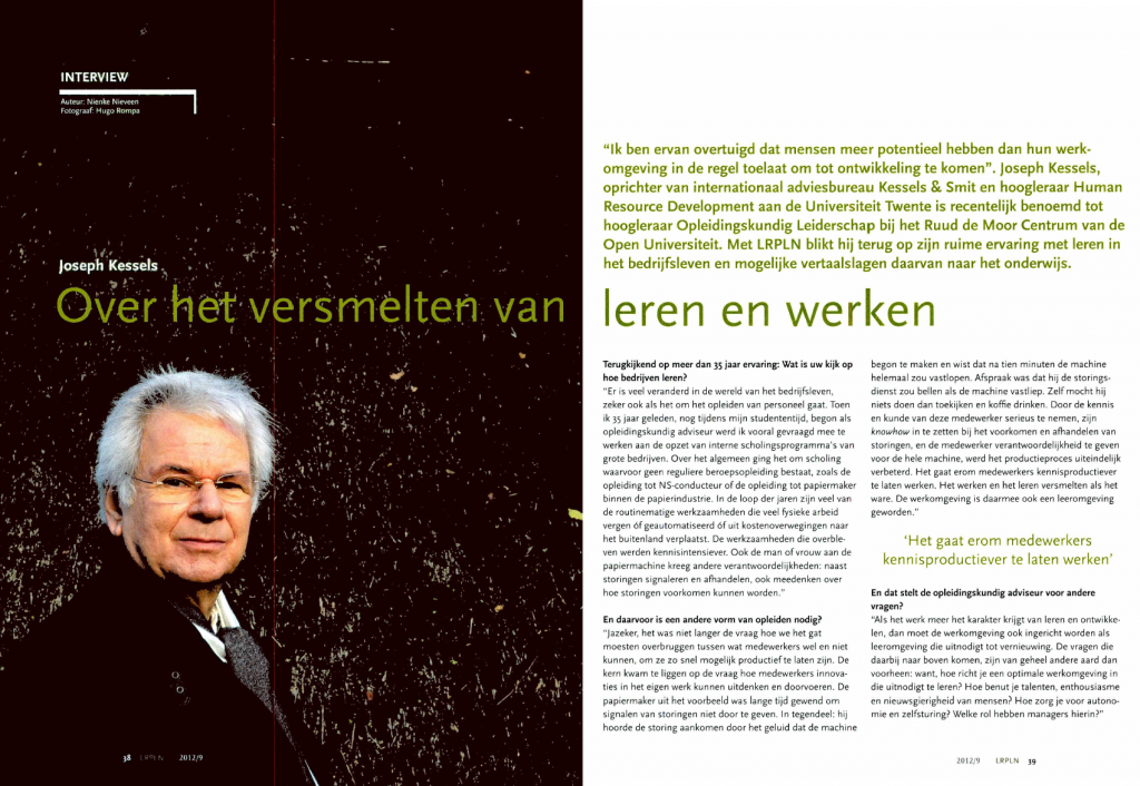 “Ik ben ervan overtuigd dat mensen meer potentieel hebben dan hun werkomgeving in de regel toelaat om tot ontwikkeling te komen”, Joseph Kessels, oprichter van internationaal adviesbureau Kessels & Smit en hoogleraar Human Resource Development aan de Universiteit Twente is recentelijk benoemd tot hoogleraar Opleidingskundig Leiderschap bij het Ruud de Moor Centrum van de Open Universiteit. Met LRPLN blikt hij terug op zijn ruime ervaring met leren in het bedrijfsleven en mogelijke vertaalslagen daarvan naar het onderwijs.