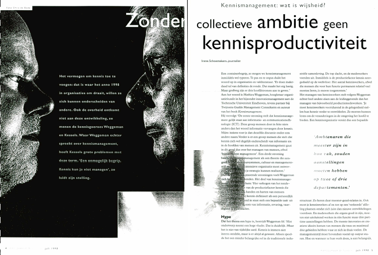 Het vermogen om kennis toe te voegen: dat is waar het anno 1998 in organisaties om draait, willen ze zich kunnen onderscheiden van andere. Ook de overheid ontkomt niet aan deze ontwikkeling, zo menen de kennisgoeroes Weggeman en Kessels. Waar Weggeman echter spreekt over kennismanagement, heeft Kessels grote problemen met deze term. 'Een onmogelijk begrip. Kennis kun je niet managen', zo luidt zijn stelling.