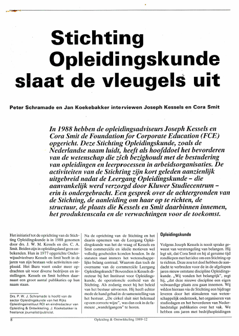 In 1988 hebben de opleidingsadviseurs Joseph Kessels en Cora Smit de Foundation for Corporate Education (FCE) opgericht. Deze Stichting Opleidingskunde, zoals de Nederlandse naam luidt, heeft als hoofddoel het bevorderen van de wetenschap die zich bezighoudt met de bestudering van opleidingen en leerprocessen in arbeidsorganisaties. De activiteiten van de Stichting zijn kort geleden aanzienlijk uitgebreid nadat de Leergang Opleidingskunde - die aanvankelijk werd verzorgd door Kluwer Studiecentrum - erin is ondergebracht. Een gesprek over de achtergronden van de Stichting, de aanleiding om haar op te richten, de structuur, de plaats die Kessels en Smit daarbinnen innemen, het produktenscala en de verwachtingen voor de toekomst.