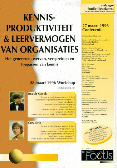 De conferentiedag op 27 maart biedt u het veld van deskundigen op het gebied van kennisproduktiviteit & leervermogen van organisties. U krijgt inzicht in de onderzoeksresultaten naar kenniswerk in 8 lerende organisaties. NS Infrastruktuur werd met haar neus op de feiten gedrukt toen essentiale kennis verloren ging. Nedap is een van de pioneers in Nederland op het gebied van kennismanagement. Welke nieuwe ervaringen hebben zij de afgelopen 2 jaar opgedaan? U heeft overigens een unieke mogelijkheid om in de keuken te kijken van Skandia Assurance & Financial Services uit Zweden. Skandia is al jaren bezig met kennisproduktiviteit en is in staat om haar organisatiekennis te meten! Ze hebben dan ook niet voor niets een Director of Intellectual Capital aangesteld om de belangrijkste 'asset' van het bedrijf te managen!