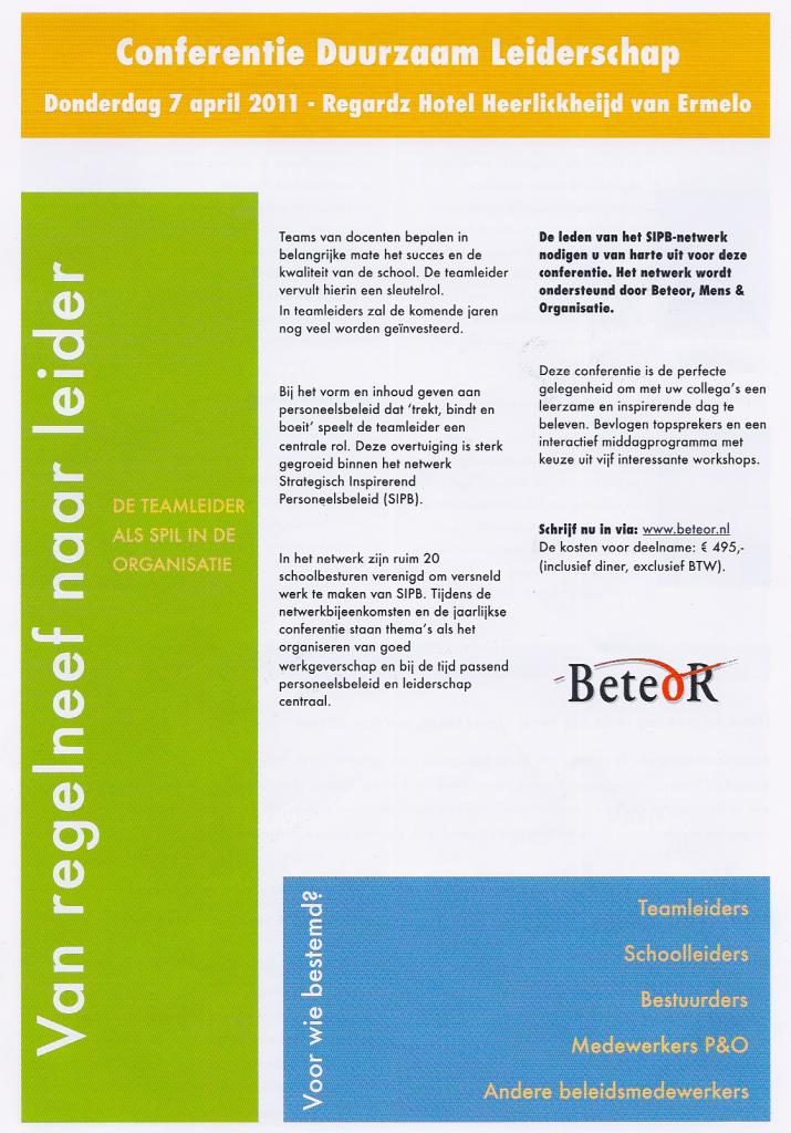 Op 7 april 2011 organiseert SIPB, het netwerk van ruim 20 schoolbesturen een conferentie rond leiderschap en de ontwikkeling van teams.