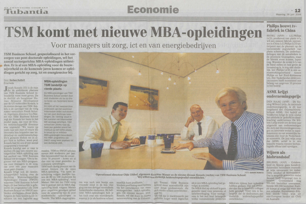 Kuitert, G. (26 juni 2006). TSM komt met nieuwe MBA-opleidingen. Tubantia, p. 12.