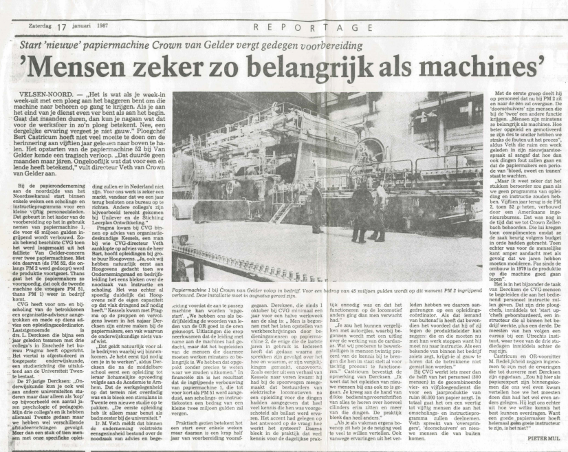 Mul, P. (17 januari 1987). Start “nieuwe” papiermachine Crown van Gelder vergt gedegen voorbereiding. p. 19.