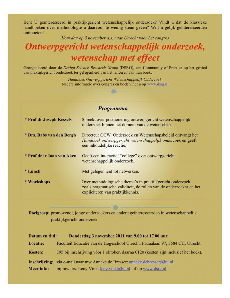 Op 3 november verschijnt het boek: Ontwerpgericht Wetenschappelijk Onderzoek, onder redactie van Joan van Aken en Daan Andriessen. Ter gelegenheid van deze boeklancering organiseert de Design Science Research Group (DSRG) een symposium waaraan de diverse auteurs bijdragen leveren.