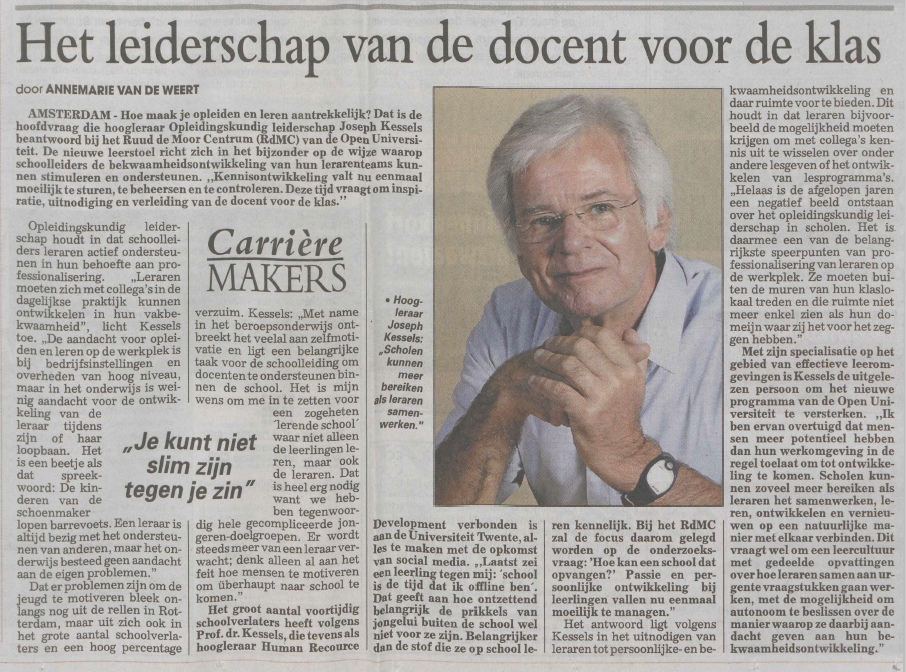 van de Weert, A. (27 augustus 2011). Het leiderschap van de docent voor de klas. De Telegraaf (Carriere), p. T25.